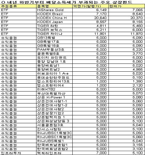 내년 하반기부터는 해외ETF(상장지수펀드)뿐만 아니라 증시에 상장돼 주식처럼 거래할 수 있는 폐쇄형(환매금지형) 부동산펀드와 해외펀드에 대해서도 15.4%의 배당소득세가 부과된다.
