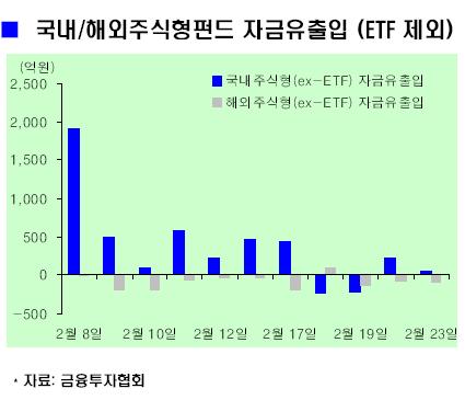 국내 주식형 펀드로 2일째 자금이 유입됐지만 규모는 크게 축소됐다.