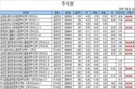 펀드별로는 중소형주펀드와 그룹주펀드가 상대적으로 좋았다. 중소형주에 집중투자하는 삼성자산운용의 '삼성중소형FOCUS증권투자신탁 1[주식](A)'가 -4.52%로 가장 선방했다.