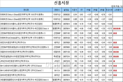 이머징펀드 중에서는 미래에셋자산운용의 '미래에셋China A Share증권자투자신탁 1(H)(주식)종류A' 0.40%로 유일하게 플러스 수익률을 기록했다. 또 프랭클린템플턴운용의 '프랭클린인디아플러스증권자투자신탁[주식-재간접형]'가 -4.78%, 신한BNPP자산운용의 '신한BNPP봉쥬르인디아증권자투자신탁(H)[주식](종류A 1)' -5.09%를 각각 기록했다.
