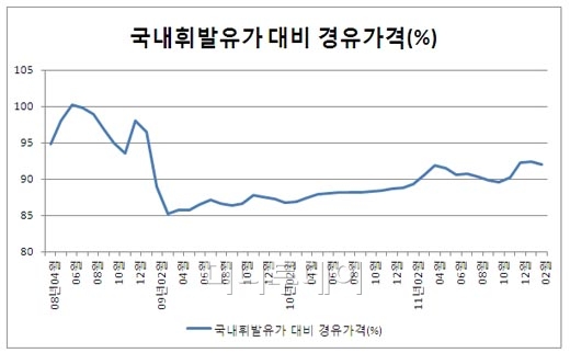 유가정보사이트인 오피넷에 따르면 14일 전국 주유소에서 판매 중인 경유의 평균 가격은 1852.31원으로 휘발유가격인 2027.46원의 91.4% 수준이다. 휘발유 대비 경유가격은 지난 2009년 3~5월에는 85% 수준을 유지하다 이후 꾸준한 증가추세를 보이고 있다. '싸고 연비 좋다'는 경유를 가리키는 수식어 가운데 이제 '싸다'는 표현은 옛말이 돼 버린 셈이다.
