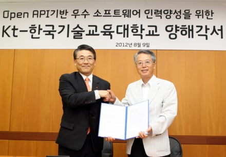 KT(63,000원 ▼800 -1.25%)와 한국기술교육대학교는 9일 천안 한국기술교육대학교 본원에서 우수 소프트웨어 인력 양성을 위한 전문교육 프로그램 개발과 실습과정 개설을 위한 MOU(양해각서)를 체결했다.
