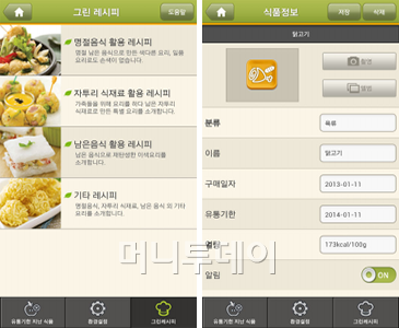 냉장고 또는 냉동고 선택 시 관리화면으로 이동하며, 유통기한 정보가 아이콘과 함께 표시된다. 식자재 등록은 미리 나누어진 분류를 통해서 간단히 등록이 가능하며, 사용자가 직접 상세 내용을 입력해도 된다. 또는 바코드 인식을 통해서 음식 정보를 빠르고 편하게 등록할 수 있다.