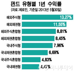 펀드평가사 제로인에 따르면 해외 주식형펀드는 최근 1년 수익률이 지난달 30일 기준으로 13.27%를 기록하는 등 단기 성과는 회복되고 있다. 이는 같은 기간 해외 채권형(11.55%), 국내 주식형(7.96%), 국내 채권형(4.47%)에 비해서도 양호한 성과다.