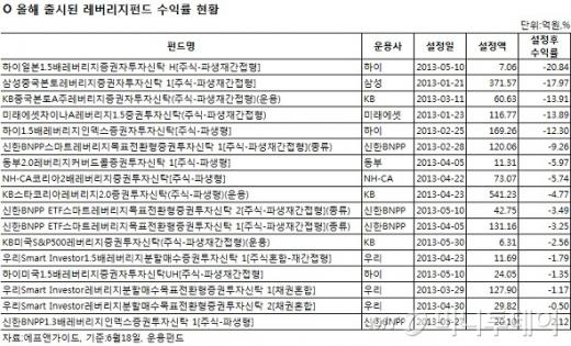 레버리지펀드는 올들어 봇물처럼 쏟아졌다. 총 42개 레버리지펀드 중 40%인 17개가 올들어 지난 5월까지 출시된 '신상'들이다. 매달 3개 이상 신상품이 선보인 셈이다. 연초 이후 이들 펀드에 순유입된 자금만 1864억원(설정액 기준)에 달한다.