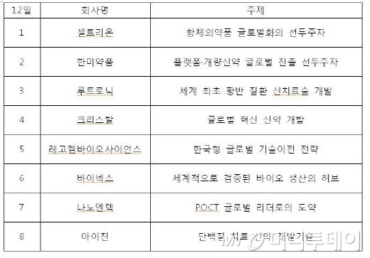 특히 12일 열리는 기업설명회 세션에는 셀트리온과 한미약품, 루트로닉, 크리스탈지노믹스, 레고켐바이오사이언스, 바이넥스, 나노엔텍, 아이진 등 차별화된 기술력을 가진 바이오기업들이 대거 참여한다.