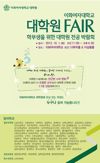 이화여자대학교(총장 김선욱)는 오는 10월 1일 교내 ECC 이삼봉홀과 다목적홀에서 대학원 전공 박람회 '제6회 대학원 FAIR'를 개최한다.