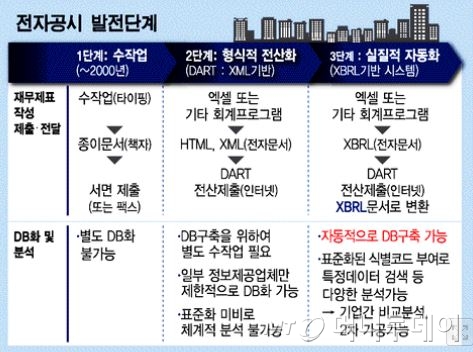 이 때문에 한국신용평가와 한국기업평가 등 신용평가사, 와이즈에프엔과 에프엔가이드 등 금융정보회사들은 공시된 상장사 재무정보를 분석하기 위해 수십명의 인력을 투입해 별도 DB에 수치를 재입력하는 작업을 해왔다.