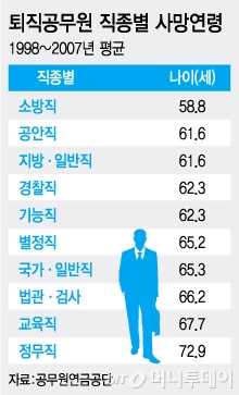 13일 공무원연금공단의 ‘연도별 퇴직연금 수급자 직종별 평균 사망연령’ 자료에 따르면 지난 1998년부터 2007년까지 퇴직한 소방공무원의 평균 수명은 58.8세로 전체 공무원 중 가장 낮았다.