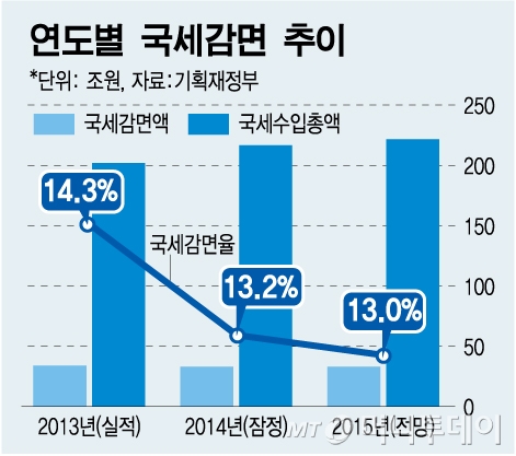 박근혜정부가 출범 당시 세운 목표다. 깎아주던 세금을 제대로 받아 재정적자를 해결하겠다는 것이었다. 하지만 현실은 거꾸로다. 지난해 정부가 비과세 또는 감면해준 세금은 32조9810억원에 달한다. 그럼에도 정부는 지난해 말 일몰이 예정됐던 조세특례항목 53개 중 7개 항목만을 종료했다. 오히려 6개 항목을 신설했다.