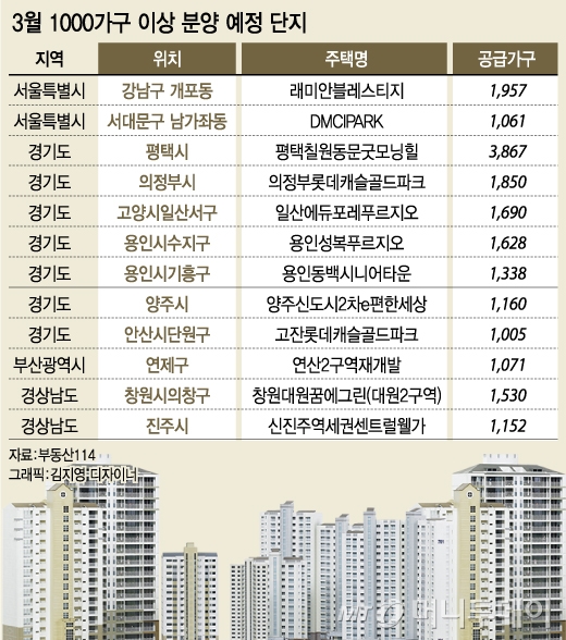 3월 분양이 예정된 1000가구 이상 대형 아파트 단지는 총 12개로 개포동 래미안블래스티지(1957가구), 남가좌동 DMC아이파크(1061가구), 일산에듀포레푸르지오(1690가구) 등 8개 단지가 수도권에 위치해 있다.