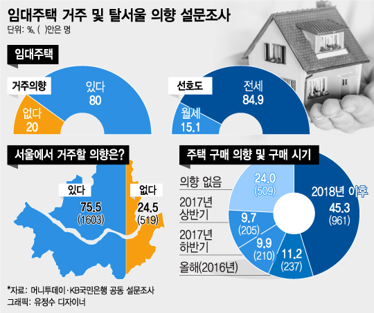 29일 머니투데이가 창사 15주년을 맞아 KB국민은행과 공동으로 실시한 '임대주택 거주 및 탈(脫)서울 의향' 설문조사에 따르면 월세(보증부 월세) 대신 전세를 선호하는 현상은 여전한 것으로 나타났다.