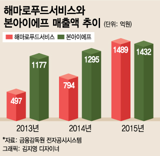 하지만 해마로푸드서비스, 본아이에프 등은 꾸준한 실적 성장을 무기로 증시에 노크했다. 해마로푸드서비스 매출은 2013년 497억원, 2014년 794억원, 지난해 1489억원으로 급증했다. 2년 만에 매출 규모가 200% 증가했다. 가맹점 수도 2013년 386개, 2014년 559개, 2015년 825개로 늘었다.