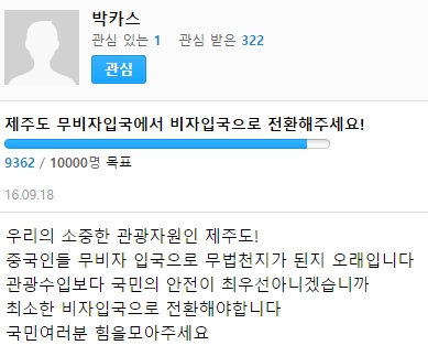 지난 18일 포털사이트 다음 아고라 청원 게시판에는 '제주도 무비자입국에서 비자입국으로 전환해주세요!'라는 제목의 이슈 청원이 발의됐다. 서명운동은 1만 명을 목표로 진행되고 있으며, 청원이 발의된 지 하루 만에 9000명을 돌파해 목표 달성을 목전에 두고 있다.