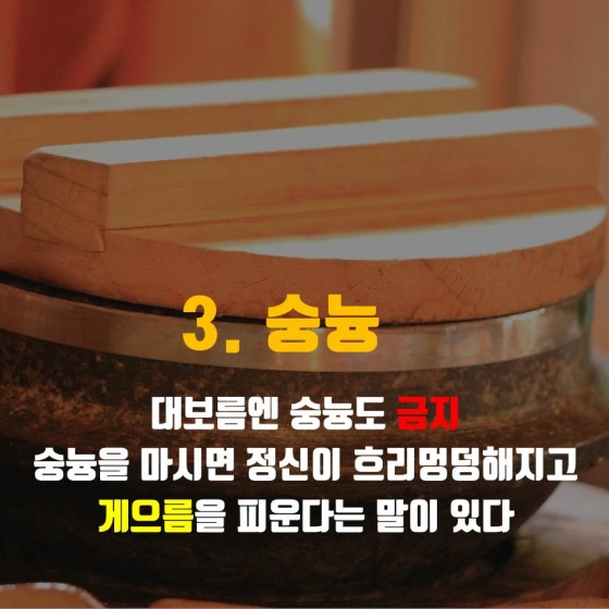 찬물뿐만 아니라 숭늉도 금기 음식이다. 숭늉을 마시면 정신이 흐리멍덩해지고 게으름을 피운다고 믿었다. 이 때문에 대보름에는 물 대신 챗국이나 맑은 콩나물국을 마셨다.