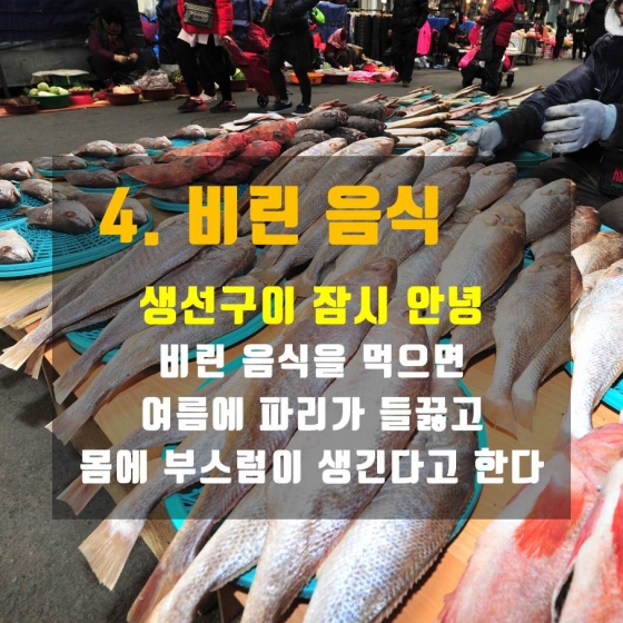 생선과 같이 비린 음식을 먹으면 여름에 파리가 들끓고 몸에 부스럼이 생긴다고 여겼다.