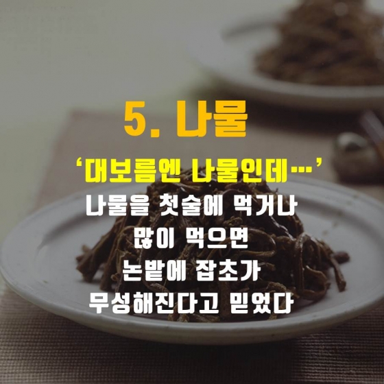 보통 대보름에는 한 해 동안 더위 먹는 것을 피하기 위해 묵은 나물을 먹는다. 하지만 첫술에 나물을 먹거나 나물을 많이 먹는 것은 금기시됐다. 논밭에 잡초가 무성해진다고 여겼기 때문이다.