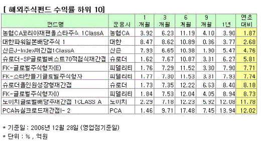 ◇ 2006 해외펀드 성적은 =지난해는 중국증시의 호조로 중국펀드들이 수익률 최상위권에 올랐다. 신한BNP파리바의 '봉주르차이나주식1'은 지난달 28일 기준으로 연초대비 73.34%의 수익률을 올렸다. 이어 미래에셋자산운용의 '미래차이나솔로몬법인주1ClassI'와 'ClassA'가 각각 61.27%와 60.19%로 뒤를 이었다.