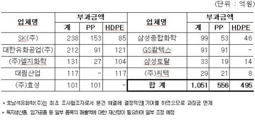 업체별 과징금 규모는 SK가 238억원, 대한유화공업 212억원, LG화학 131억원 등이며 최초로 자진신고한 호남석유화학은 과징금을 100% 면제받았고 삼성토탈 등도 자진신고로 과징금을 감면받았다.