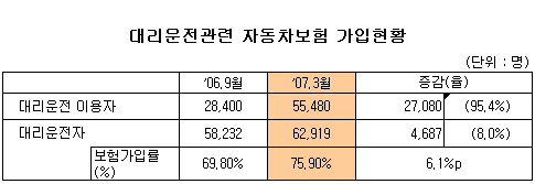대리운전자의 보험가입도 꾸준히 늘어나고 있다. 3월말 현재 대리운전자보험 가입자는 6만3000명으로 지난해 9월 대비 8%(5000명) 증가했다. 이에 따라 전체 대리운전자의 보험가입률도 69.8%에서 75.9%로 높아졌다.