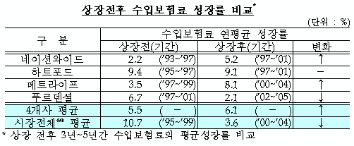 먼저 수입보험료(판매량)의 경우 생보시장 전체의 성장률은 10.7%에서 3.6%로 대폭 줄어든 반면 상장 4개사의 경우 상장전 5.5%에서 상장후 6.1%로 0.6%p 높아졌다. 상장후 대형화로 인해 규모의 경제 효과가 나타났기 때문으로 풀이된다.