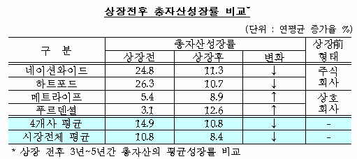 상장 생보사들의 자산성장률도 비상장 생보사들을 앞질렀다. 상자 4개사의 총자산 성장률은 10.8%로 시장평균 성장률 8.4%에 비해 2.4%p 높았다. 특히 2000년과 2001년에 상장한 메트라이프와 푸르덴셜의 경우 성장률 증가세가 두드러졌다. 메트라이프의 경우 5.4%에서 8.9%로, 푸르덴셜 역시 3.1%에서 12.6%로 크게 높아졌다.