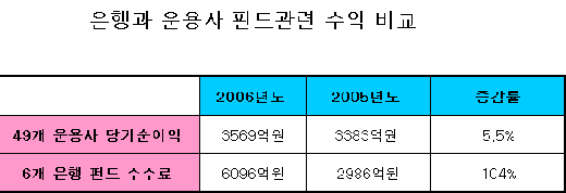 농협을 포함한 7개 은행의 수수료 수익은 6340억원. 반면 국내 49개 운용사들의 당기순이익 총합계는 지난해(2006년 3월~ 2007년 3월) 3569억원으로 2005년 회계연도보다 5.5%늘어나는데 그쳤다.