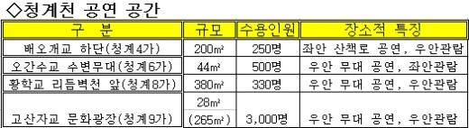 우선 시범적으로 선정된 공연장소 4곳은 △청계4가 배오개다리 △오간수교 수변무대 △황학교 리듬벽천 앞 데크무대 △고산자교 문화광장 등이다.