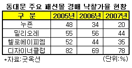 지난 2004년이후 경매를 통해 매각된 동대문 패션몰은 밀리오레 46건, 헬로에이피엠 43건, 누죤 23건, 디자이너클럽 8건 등 총 120건이다. 낙찰가율은 그리 높지 않아 올해의 경우 감정가대비 디자이너클럽 78%, 밀리오레 44%, 헬로에이피엠 35% 등이다. 동대문운동장 뒷쪽에 위치한 누죤은 낙찰가율이 20%에 그치고 있다.
