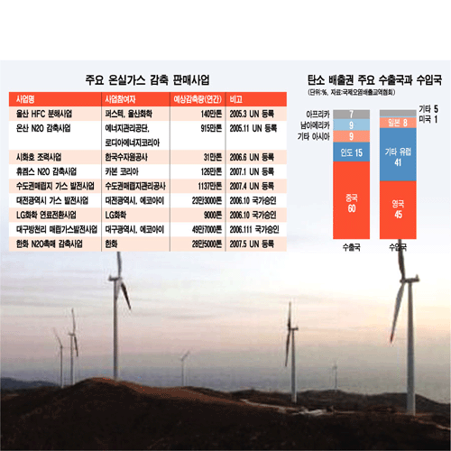 ◆연간 300억 달러의 배출권 거래 시장= 선진국들은 교토의정서에 따라 2008년부터 2012년까지 온실가스 배출량을 의무적으로 줄여야 한다. 다만 목표량을 못 채우면 목표량을 초과 달성한 나라로부터 온실가스 배출권을 사서 채울 수 있다. 국가나 기업에 개별적으로 할당된 배출 허용량을 기준으로 초과분이나 여유분을 사고 팔거나, 국가나 기업이 온실가스 감축 사업을 벌여 확보한 감축분을 사고 팔 수도 있다.