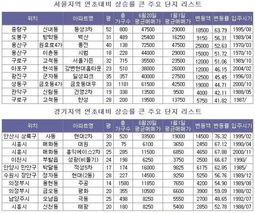 이밖에 △도봉구 방학동 벽산아파트 31평형(51.05%) △용산구 원효로4가 풍전아파트 40평형(52.63%) △용산구 이촌동 시범 18평형(51.72%) △구로구 고척동 서울가든 32평형(51.06%) 등도 높은 상승률을 보였다.