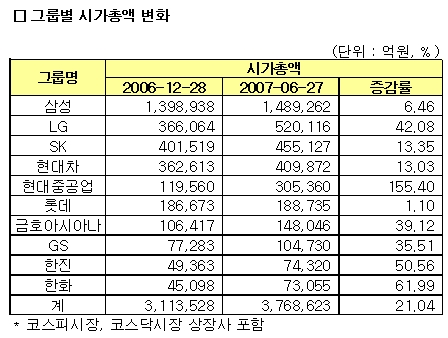 한편 그룹별 시가총액은현대중공업(397,000원 ▲7,000 +1.79%)이 30조5360억원으로 지난해말보다 155.30% 증가했다.