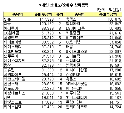 [표]코스닥 개인 순매수/순매도 상위 20개사