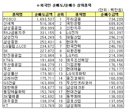[표]코스피 외인 순매수/순매도 상위 20개사