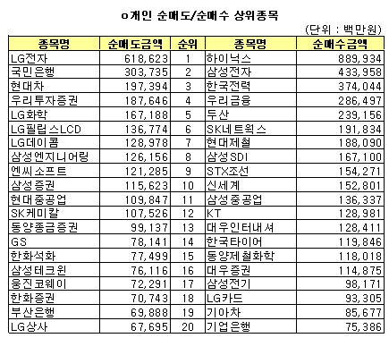[표]코스피 개인 순매수/순매도 상위 20개사
