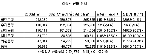 신한은행의 수익증권 판매 잔액은 상반기 중 4조4623억원 증가해 지난해 연말 대비 26.2% 급증했고, 다음으로 국민 2조2065억원(9.1%), 하나 1조6102억원(19.0%), 농협 1조6010억원(43.7%), 외환 1조1772억원(24.9%), 우리 6966억원(5.9%) 순이었다. 증가율로는 농협이 가장 높은 비중을 차지했으나 증가액 중 상대적으로 수수료가 적은 초단기투자금융(MMF)이 1조756억원을 차지해 질적인 면에서는 다소 떨어졌다.