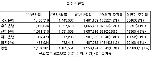 지난 28일 현재 원화대출금 잔액 순위는 국민(141조7461억원) 우리(104조3890억원), 신한(98조5661억원), 농협(92조2519억원), 하나(76조4644억원), 외환(33조8093억원) 등의 순으로 지난해 연말과 같았다.