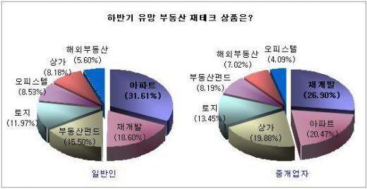 하반기 유망 부동산 재테크 상품으로는 아파트가 30.18%의 응답률로 가장 높게 나타났고, 재개발(19.67%), 부동산펀드(14.56%), 토지(12.16%)가 뒤를 이었다. 상가(9.7%), 오피스텔(8.0%), 해외부동산(5.8%) 등은 상대적으로 관심도가 낮았다.