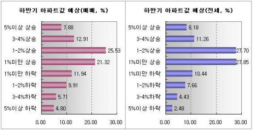 부동산정보업체 스피드뱅크가 지난 6월22~28일까지 일반인과 중개업소 관계자 등 1332명을 대상으로 '하반기 부동산시장 전망 조사'를 실시한 결과(신뢰구간 95%, 표본오차 ±2.7%포인트) 전체 응답자의 67.6%는 하반기에도 아파트 매매가격이 상승할 것이라고 답했다.