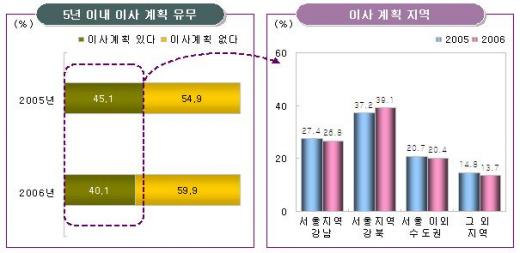이사할 계획을 갖고 있는 시민들을 대상으로 이사 예정지를 물은 결과 강북지역을 꼽은 시민이 39.1%에 달한 반면 강남은 26.8%에 그쳤다. 1년전에 비해 강북으로 이사하겠다는 응답은 1.9%포인트 증가한데 비해 강남으로 옮기겠다는 응답은 0.6%포인트 줄었다. 수도권으로 이사하겠다는 응답은 20.4%, 그 외 지역은 13.7%였다.