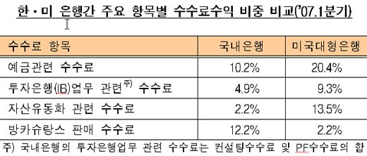 비이자이익의 대부분을 차지하는 수수료 이익의 경우, 국내은행은 송금, 자동인출 등 예금 관련 수수료와 선진금융업무인 IB 관련 수수료 등에서 모두 미국 대형은행에 비해 크게 떨어졌다. 올해 1/4분기 전체 수수료이익 중 예금 관련 수수료 이익은 국내은행들이 10.2%인데 반해, 미국 대형은행들은 20.4%에 달했고, IB 관련 수수료도 국내가 4.9%로 미국 대형은행 9.3%의 절반 수준에 머물렀다.