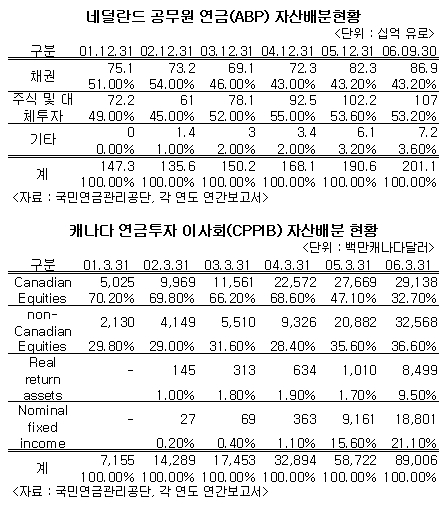 캐나다의 연금투자이사회(CPPIB)의 경우 주식투자 비중은 더욱 높다. 지난해 3월말 현재 운용자산 890억캐나다달러 중 자국 주식에 32.7%를 291억3800만캐나다달러를 투자하고 있다. 해외 주식에는 이보다 많은 325억6800만캐나다달러를 투자하고 있다.