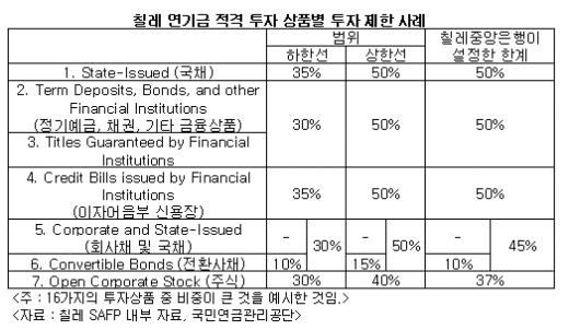 칠레의 연금제도의 또다른 특징은 SAFP와 칠레 중앙은행이 투자 상하한선을 제시, 연기금 투자 포트폴리오를 정한다는 것이다. 연금법에 국채의 범위는 35~50%인데 칠레중앙은행이 설정한 한계는 50%다. 주식의 경우 연금법은 30~40%의 제한을 두고 있지만 칠레중앙은행은 37%의 제한선을 두고 있다.