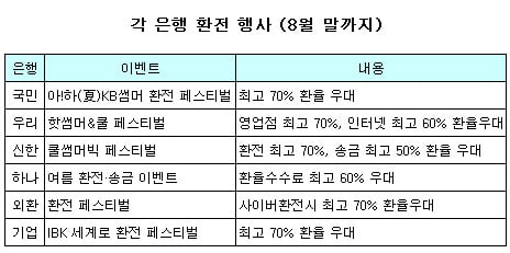 우리은행은 우리은행 영업점 및 인터넷을 통해 환전한 개인고객에게 최고 70%까지 환율을 우대해 주는 '07 핫 썸머 & 쿨 페스티벌'을 진행한다. 단, 인천국제공항지점은 제외된다.
