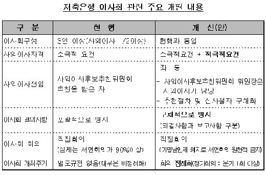 상호저축은행들의 사외이사 요건이 강화돼 앞으로 대주주 입맛에 맞는 사외이사 선임이 어려워진다. 또한 이사회를 서면 결의로 대체하지 못하게 되고 정기이사회를 분기 1회이상 개최하도록 의무화된다.