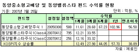 이 펀드는 수익률 관리를 위해 지난 4월 12일 순자산이 500억원에 이른 시점에 판매를 중지한 상태다. 그 뒤 후속펀드로 선보인 동양밸류스타펀드도 최근 3개월 34%에 이르는 수익을 내고 있다.
