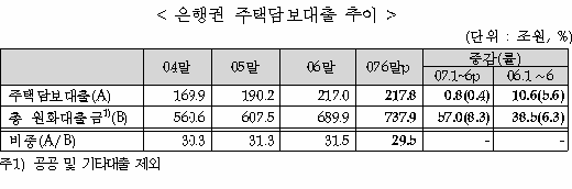 이에 따라 은행 총 원화대출금에서 주택담보대출이 차지하는 비중은 29.5% 수준으로 2004년말 이후 처음으로 30% 아래로 떨어졌다.