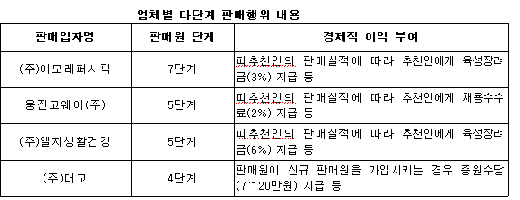 공정위에 따르면 4개사는 4~7단계에 이르는 판매조직을 운영하면서 실제 다단계 영업을 해왔으나 규제를 피하기 위해 다단계업체로 신고하지 않아 적발됐다.