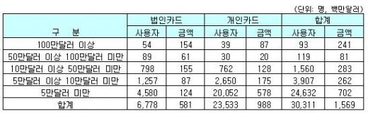이에 따르면 전체 카드사용자의 19%인 5만달러 이상 사용자는 5679명(개인+법인카드)으로 이들의 사용금액은 전체의 55%인 8억7000만달러를 나타냈다. 10만달러 이상 고액사용자도 1772명에 달했다.