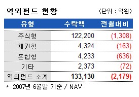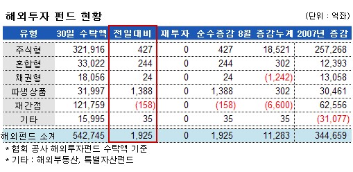 같은 날 해외 주식형펀드는 427억원 늘어 전체 수탁액이 32조1916억원으로 집계됐다. 일별 자금 유입규모로는 해외 주식형펀드가 국내 주식형펀드를 앞선 지 3일 만이다.